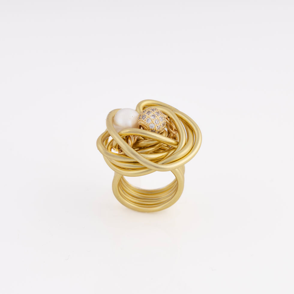 Golden aluminium wire 12” gauge, freshwater pearl 8mm, Zirconia bead 8mm. Size 6.
